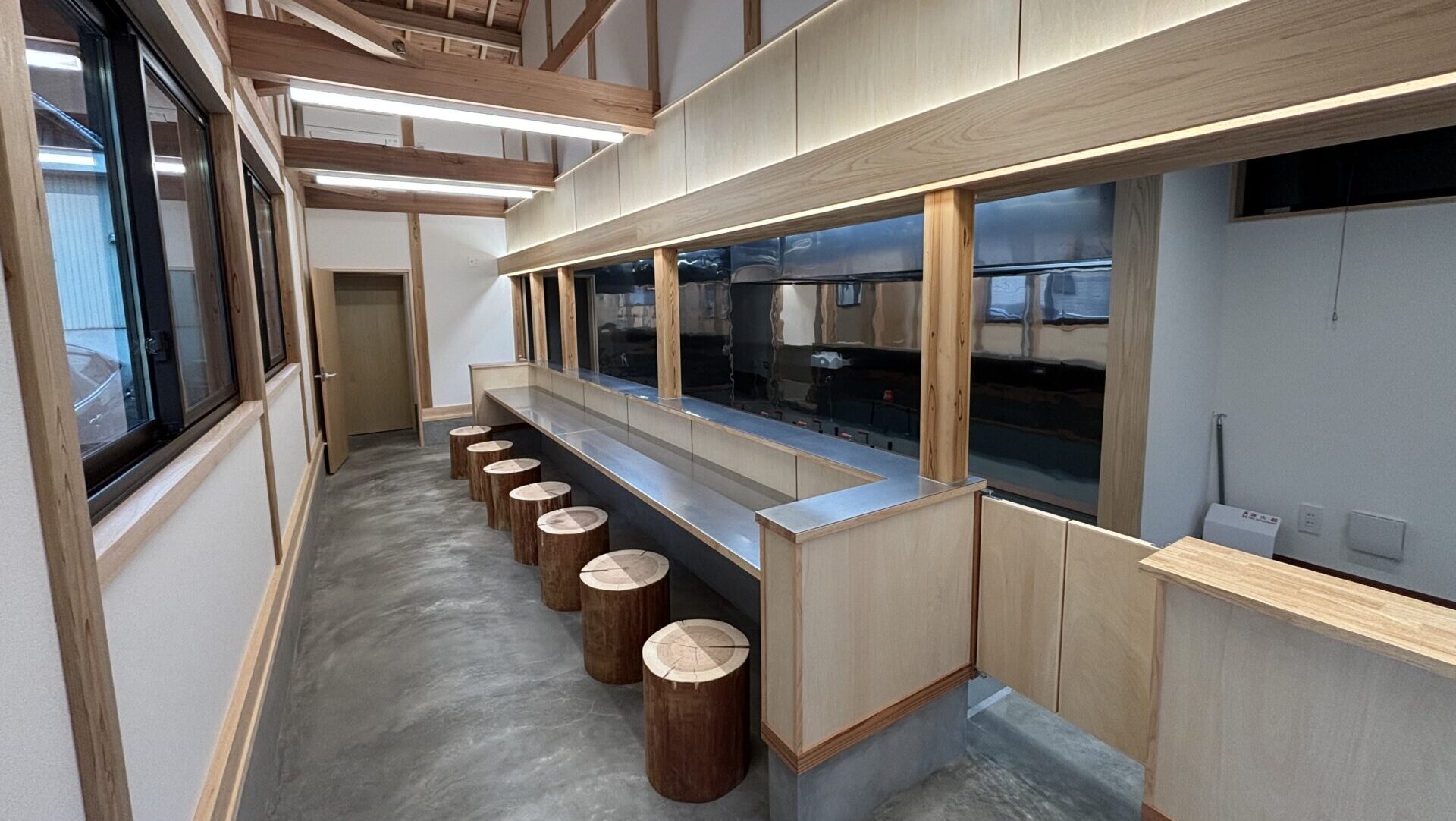 小浜市貴船の粋なラーメン屋さんに、大きな杉の丸太の椅子を納めさせていただきました