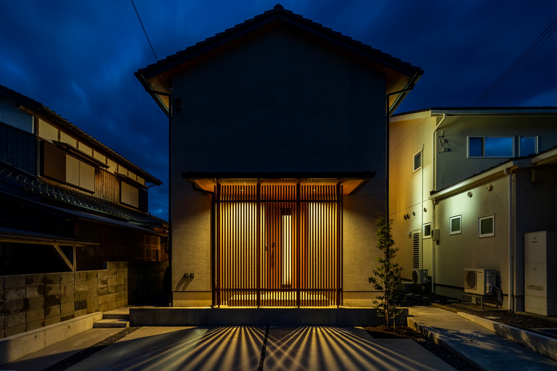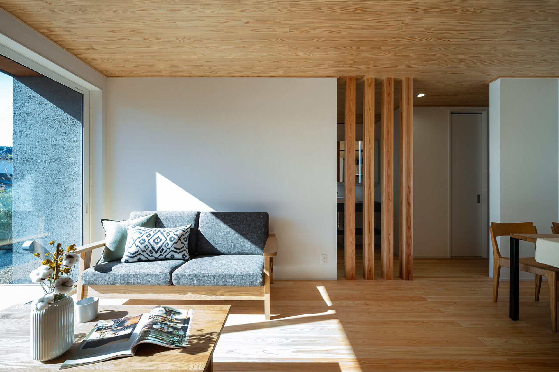 引き締まった印象ながらゆたかな表情を見せる京若狭杉の縦格子。